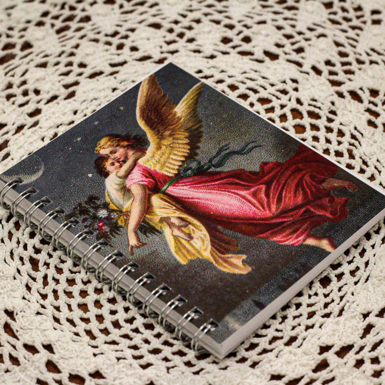 Angel in Flight image by Kaulbach is from a turn-of-the-century German lace Holy Card crafted by Gebr. C. & N, Bensiger, Einsiedein. The translation is: "Child, come through the Night to the Light. You, down on earth, do not cry! (despair)." Translation is noted on the interior or back cover.