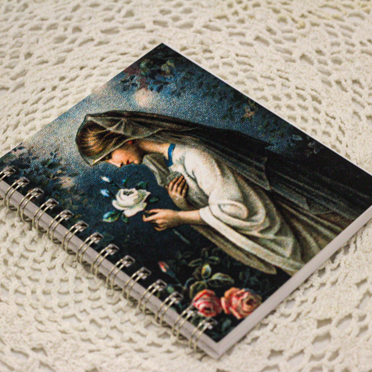 Image is from a turn-of-the-century Holy Card and depicts the Blessed Mother as "The Mystical Rose". The caption on the original holy card is "MYSTICAL ROSE. Thou art all beautiful, O Mary, and without stain", which is featured on the interior cover or back page. A Full of Grace USA Original Product.